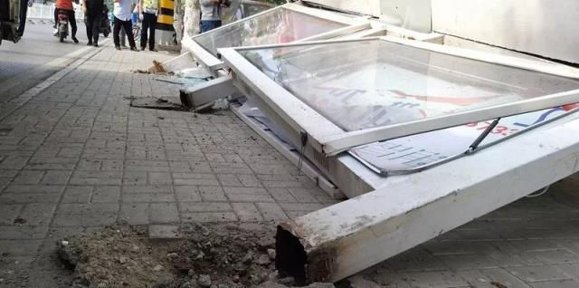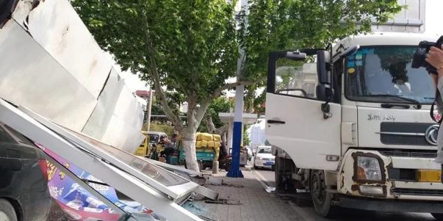 在現(xiàn)場(chǎng)看到,闖禍的洗掃車,停在東側(cè)的非機(jī)動(dòng)車道上,而旁邊被撞的公交站臺(tái)已經(jīng)倒地,站臺(tái)棚損毀嚴(yán)重,站臺(tái)下面還砸著一輛黑色私家車。