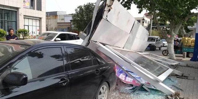 洗掃車司機(jī)說:“我每天都開車沿魏武大道東側(cè)的非機(jī)動(dòng)車道清掃,但今天下午3點(diǎn)鐘左右,因?yàn)槎惚芤惠v三輪車,無意間撞倒了站臺(tái)上的棚頂,而且旁邊停放的這輛黑色私家車也被砸壞。”