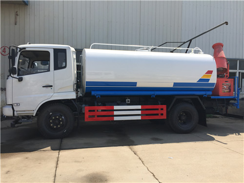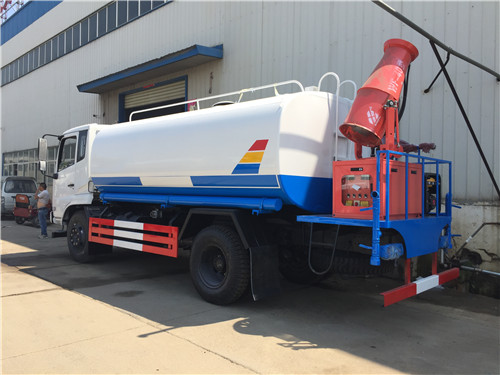 灑水車前裝有鴨形噴嘴或圓頭沖嘴,后面裝有圓柱開灑水噴嘴或蓮蓬頭噴嘴,后部有一工作平臺,裝配有水炮。后部還可裝8個噴嘴(選裝)噴水器一般用于沖洗街道,起除塵和降溫作用,其噴水器可以用調節噴嘴螺紋的方法改變噴水器的噴灑方向和角度,高射水炮可以用于城鄉園林綠化及應急消防。蓮蓬嘴可以澆落路中間噴水器沖起的灰塵,起到清潔空氣的作用。