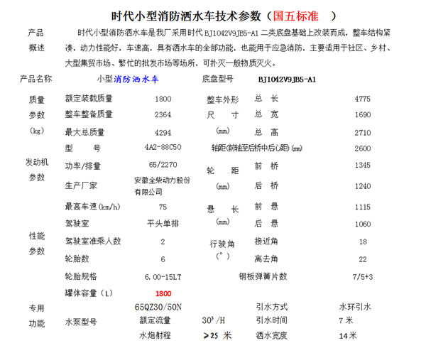 采用東風(fēng)多利卡底盤EQ1110TFJ,單排或排半駕駛室,配備朝柴120馬力國(guó)五發(fā)動(dòng)機(jī),825-16輪胎,外形尺寸7650×2300×3170(mm),消防泵后置帶卷簾門,水罐容積6.5立方米,東風(fēng)消防水車配備20或30消防泵和消防炮,射程≥45米,消防灑水車可用于森林消防滅火,社區(qū),村鎮(zhèn)等一般性消防戰(zhàn)備滅火,同時(shí)也可以用于綠化灑水,抗旱供水運(yùn)水等。該車罐體有效容積:6噸-8噸,該車帶國(guó)家免征公告。帶專用灑水泵,可自吸自排,帶前沖后灑,側(cè)噴,后工作平臺(tái)上配灑水高炮.