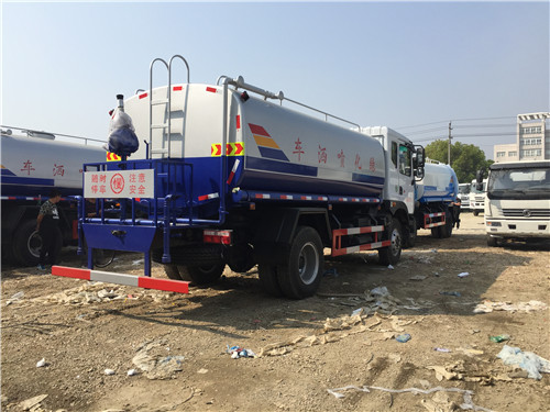 罐體用4MM碳鋼板制作,罐內隔板具有防波作用,以減低汽車行駛時罐體液體的沖擊。整車帶一個專用灑水泵(垂直最大吸程6米),灑水寬度14米,射程28米。多功能灑水車配備2個前沖(噴)(能將路面泥巴、塵土、垃圾沖干凈);2個后灑(能均勻地將水灑在路面,一次灑水寬度14米)、2個側噴(花灑)(能均勻地將路旁綠化帶澆灌)、帶1個后工作平臺,平臺上安裝1個綠化灑水高炮(灑水炮可全方位旋轉,可連續調成直沖狀、大雨、小雨、毛毛雨,霧狀可調節沖洗高大樹木),引水時間<5min,流量90m3/h。帶1個消防接頭,帶1個自流閥,1個過濾裝置、人性化爬梯及側防護欄,安裝灑水音樂喇叭。