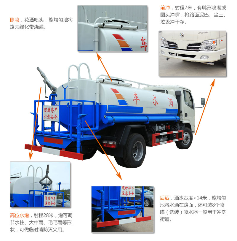 1. 噴藥灑水車:加裝噴藥裝置,噴藥射程15-80米可選,裝水容積4-20方可選。