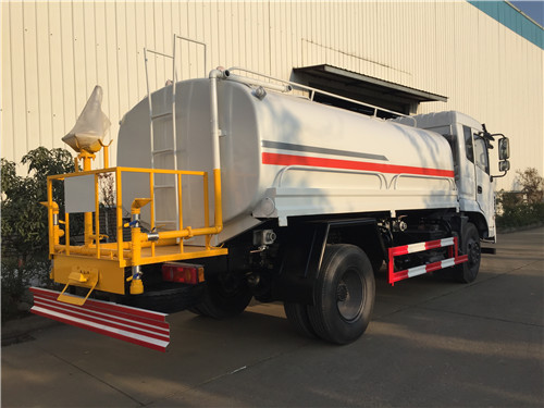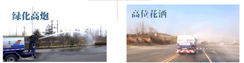 灑水車前裝有鴨形噴嘴或圓頭沖嘴,后面裝有圓柱開灑水噴嘴或蓮蓬頭噴嘴,后部有一工作平臺,裝配有水炮。后部還可裝8個噴嘴(選裝)噴水器一般用于沖洗街道,起除塵和降溫作用,其噴水器可以用調(diào)節(jié)噴嘴螺紋的方法改變噴水器的噴灑方向和角度,高射水炮可以用于城鄉(xiāng)園林綠化及應急消防。蓮蓬嘴可以澆落路中間噴水器沖起的灰塵,起到清潔空氣的作用。