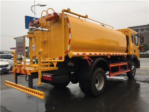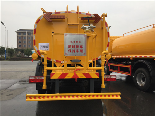 福田灑水車前裝有鴨嘴形噴嘴或圓頭沖嘴,后面裝有圓柱形灑水噴嘴或蓮蓬頭噴嘴,后部有一工作平臺(tái),裝配有水炮。后部還可裝8個(gè)噴嘴。