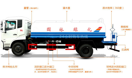 大運灑水車配置有大功率灑水泵,灑水泵帶自吸功能,能垂直吸6米,吸力非常大,還帶有消防接水口,能快速接水,灑水裝置有前沖,后灑,側噴,后工作平臺,平臺上安全綠化灑水水炮,其灑水車寬度14米,水炮射程可達30米,綠化灑水水炮可旋轉360°,還可調節成水柱裝,霧狀,大中小可任意調解,射程非常遠。