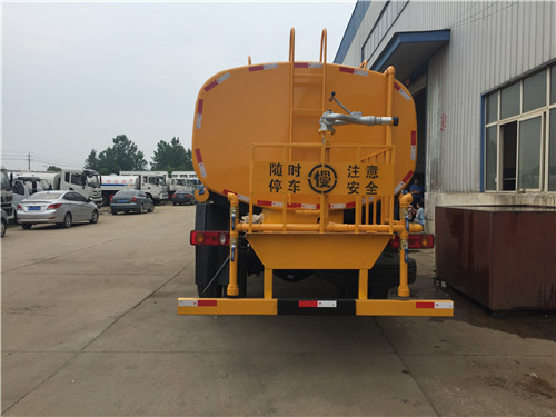 灑水車的工作平臺主要采用花紋防滑板制作而成,防滑板的厚度5毫米,平臺是寬度50-70公分,高度60-80公分,主要是便于工作人員安全操作而設計的尺寸,另外工作平臺上還設計的有腳踏板,便于工作人員上下,平臺上面安裝的綠化灑水炮,主要用于路面沖洗,園林綠化,以及應急消防。綠化灑水炮的工作狀態,可以360度旋轉,射程30米左右,可以調節成大雨、小雨、毛毛雨和柱狀。后灑裝置主要用于路面養護,噴灑寬度15米左右。側噴主要用于公路綠化帶噴灑綠化。