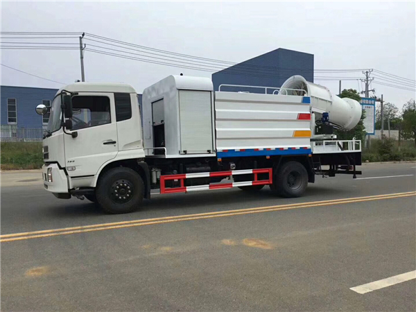 東風(fēng)12噸抑塵車選配50米噴霧機(jī)達(dá)到除塵效果。霧炮機(jī)是根據(jù)風(fēng)送原理,先使用進(jìn)口高壓泵、微細(xì)霧化噴嘴將水霧化,再利用風(fēng)機(jī)風(fēng)量和風(fēng)壓將霧化后的水霧送到較遠(yuǎn)距離,使得水霧到達(dá)較遠(yuǎn)距離同時(shí)能夠覆蓋更大面積,水霧與粉塵凝結(jié)后降落,從而達(dá)到降塵目的。