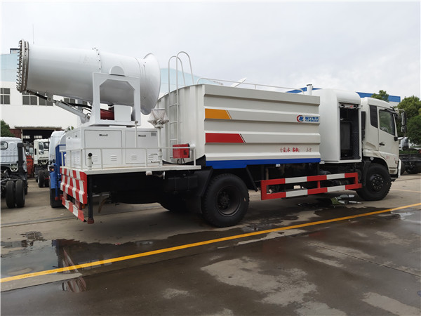 東風(fēng)天錦12噸霧炮車(chē)基本配置:隨車(chē)配備大功率專用霧炮泵(標(biāo)配隨州億豐霧炮車(chē),選配杭州威龍霧炮泵),比同類(lèi)霧炮泵壓力大、吸程遠(yuǎn)、使用壽命長(zhǎng),克服其他霧炮泵易被雜物纏住、壓力小、吸水慢的缺點(diǎn)。整車(chē)帶前沖(噴)、后灑、側(cè)噴、罐體后部帶工作臺(tái),平臺(tái)上安裝綠化高壓霧炮炮。霧炮炮可全方位旋轉(zhuǎn),可連續(xù)調(diào)成直沖狀、開(kāi)花狀、大雨、小雨、毛毛雨、半霧狀水流,以適合不同狀況下的需求。