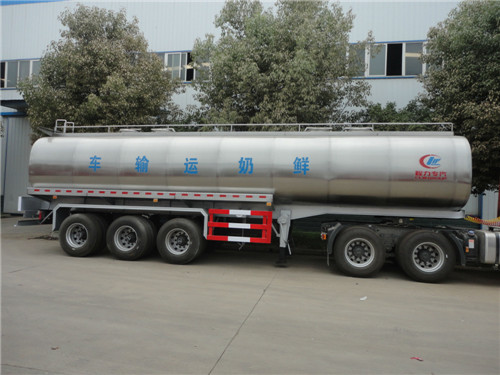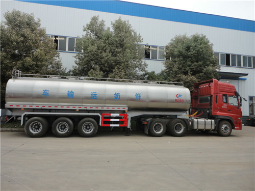 2、鮮奶運輸車罐體容積45立方,分5倉,罐體外部需作保溫層防止鮮奶變質,罐體內部用特種設備拋光,可充分保證鮮奶不掛壁,內部要求光潔、無銳角,在每個奶艙內加上cip(清洗裝置)。 鮮奶運輸車罐體整體分三層,罐體內膽,材質為304/2B食品級不銹鋼,板厚度5mm,中間部分為聚氨酯發泡保溫層,厚度為80mm,人孔部分聚氨酯發泡為60mm厚。保溫效果在24小時±1℃。罐體最外部為1mm厚304不銹鋼鏡面板,。 內膽部分有清洗裝置,清洗桿(或清洗球);清洗管(Φ38mm),旋轉清洗噴頭. 外部接上水源即可自動清洗罐體,造 型美觀,結構科學,自重輕,強度好,罐口采用特制雙層保溫不銹鋼罐口5個,5個2.5寸不銹鋼自流口卸料.