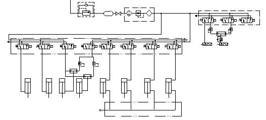 氣動(dòng)系統(tǒng)從底盤貯氣筒取得氣源,工作壓力≮0.6Mpa。根據(jù)不同的作業(yè)要求,由電磁閥控制各個(gè)氣缸實(shí)現(xiàn)不同的動(dòng)力組合。