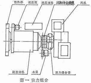 動(dòng)力組合由散熱器、副發(fā)動(dòng)機(jī)、液力偶合器、皮帶傳動(dòng)裝置、風(fēng)機(jī)組成。為清掃作業(yè)提供動(dòng)力源。動(dòng)力組合通過(guò)副框架固定在底盤大梁上。