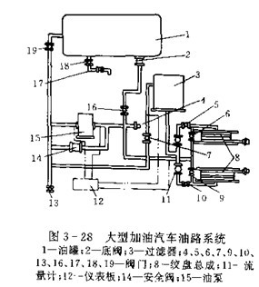 (1)油路系統要求與組成,根據加油車實際性能要求,通常是按上述的加油車五種功能,確定一個最佳油路系統,滿足作業需要,并力求結構簡單,工作可靠,工芤性良好,容易實現“三化”,管路較短。現以圖3-28大型加油車的油路系統為例,介紹設計中需注意的一些問題。該車的加油管中有閥16、油泵15、球閥7、過濾器3、流量計11、球閥5和10、絞盤總成8及加油槍等。油液是經過濾并計量后給受油容器加油的。為防止系統壓力超過規定值,在油