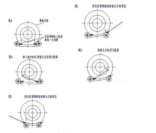 在圖C狀態(tài)下將相應(yīng)定位銷鎖旋轉(zhuǎn)按箭頭方向復(fù)位鎖定輪軸架,防止輪軸架返回。
