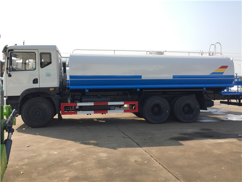 4、湖北程力灑水車整車配備優質大功率專用灑水泵(可自抽自排)、取力器、雜物過濾網、國標通用65型消防接口(可通過消防栓加水)、1套自流球閥系統(可自吸自排,最大吸程6米)、2根引水鋼絲膠管(帶陰陽快速接頭)、配鎖、水位計、高音作業喇叭,兩側及后加強型保險杠,防滑爬梯,膠管儲存筒。